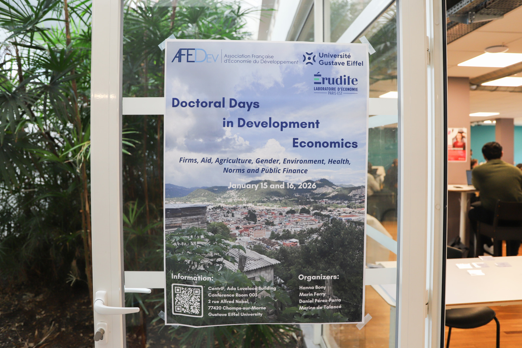 L’Université Gustave Eiffel (ERUDITE) a accueilli les Journées Doctorales du Développement organisées par Hanna BONY, Marine DE TALANCÉ, Marin FERRY et Daniel PEREZ PARRA avec l’Association Française d'Économie du Développement (AFEDEV) le 15 et 16 janvier 2026.