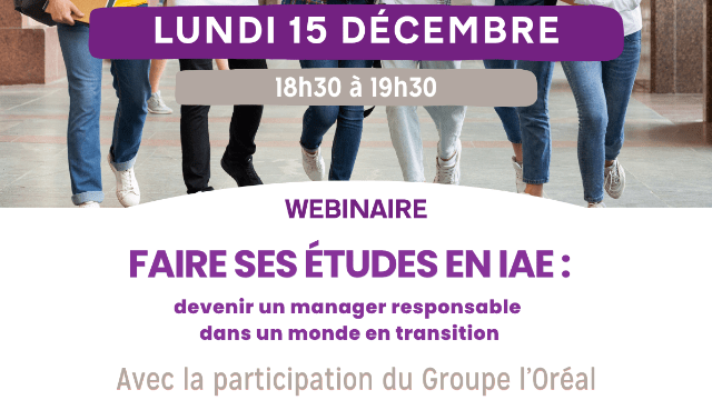 Rendez-vous le lundi 15 décembre à 18h30 pour le webinaire « Faire ses études en IAE : devenir un manager responsable dans un monde en transition » organisé par IAE FRANCE en partenariat avec @MeetyourSchool.